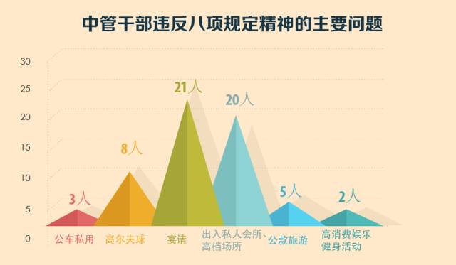 具体到违纪情形,以今年中央纪委监察部网站已公布的13次节点每周通报中曝光的1194起问题为例,出现频率较高的词汇主要有:“礼金”405次,“公车”346次,“旅游”321次,“补贴”264次,“婚宴”136次,“购物卡”109次,“办公用房”92次,“升学宴”55次,“奖金”53次……透过这些高频词可以发现,节假日期间的公款送礼、公款旅游、公款吃喝等不正之风依然存在,必须一个节点一个节点继续抓下去。通报的中管干部违反八项规定精神问题显示:违规接受公款宴请、出入私人会所问题突出 梳理中央纪委监察部网站“纪律审查”栏目公开发布的中管干部党纪处分通报中涉及违反中央八项规定精神的案例,以及“监督曝光”栏目中公开曝光的中管干部违反中央八项规定精神问题,可以发现,享乐奢靡问题突出,主要集中在违规接受公款宴请、出入私人会所、打高尔夫球等方面。其中,涉及“宴请”的共21人,占36%;涉及“出入私人会所”“高档场所”的共20人,占34%;涉及打高尔夫球的共8人,占14%,这几项加起来已超过80%。其他问题还包括公款旅游、公车私用等。 作风问题事关人心向背,事关党和国家生死存亡,必须驰而不息,坚持巩固深化。 坚持和深化,每年要有新招数,不断释放新信号。从开展公款吃喝、公款旅游,公务用车问题专项治理等,到盯住节点正风肃纪;从开通网站“四风”监督举报曝光专区,到开通客户端和微信“四风”举报;从加大执纪监督、公开曝光力度,到列入纪律审查重点,再到深挖细查、决不放过,各级纪检监察机关纠正“四风”措施不断。铲除不良作风和腐败现象滋生蔓延的土壤,根本上要靠法规制度。八项规定出台后,中央和有关部门出台了《党政机关厉行节约反对浪费条例》《关于党政机关停止新建楼堂馆所和清理办公用房的通知》《党政机关国内公务接待管理规定》等一系列规定,对中央八项规定精神进行细化和深化,进一步严明纪律要求。2015年10月印发的《中国共产党纪律处分条例》将党的十八大以来落实中央八项规定精神、反对“四风”方面的要求,转化为纪律条文;新近施行的《中国共产党问责条例》,规定对不履行或者不正确履行职责,导致“中央八项规定精神不落实,作风建设流于形式”的党组织和党的领导干部,要严肃问责。制度的生命在于执行。有了制度要见诸行动,以“钉钉子”的精神咬住不放,只有这样才能真正把纪律严起来、执行到位。